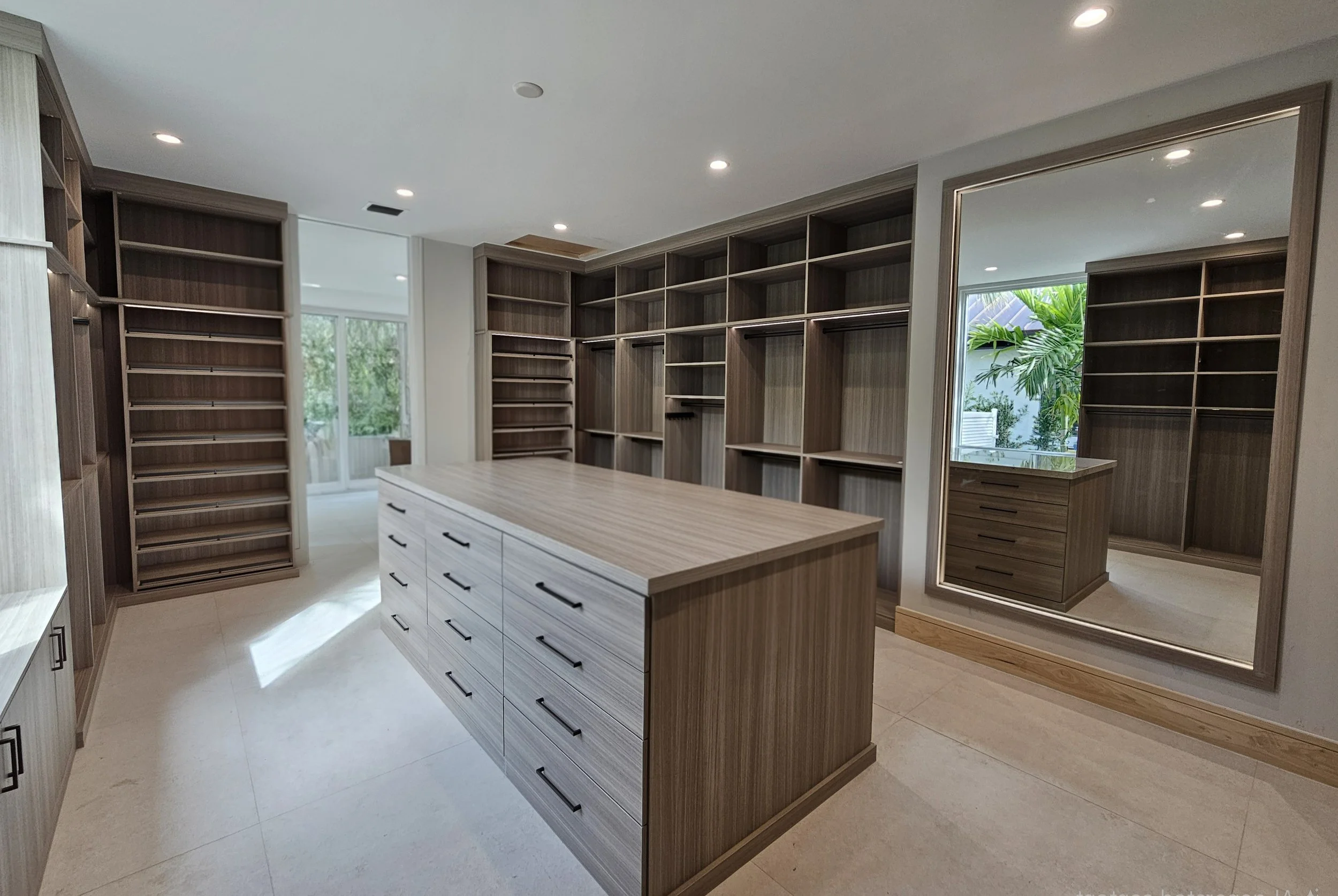 Empty beige walk-in closet with built-in shelves, rods, and black pulls, with tile flooring.